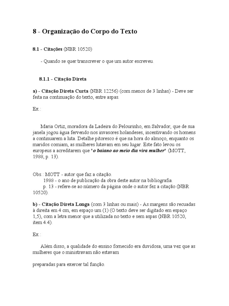 8.1 - Citaes (NBR 10520) - Quando se quer transcrever o que um autor escreveu. 8.1.1 - Citao Direta a) - Citao Direta Curta (NBR 12256) (com menos de 3 linhas) - Deve ser feita na continuao do texto, entre aspas. Ex.: Maria Ortiz, moradora da Ladeira do Pelourinho, em Salvador, que de sua janela jogou gua fervendo nos invasores holandeses, incentivando os homens a continuarem a luta. Detalhe pitoresco que na hora do almoo, enquanto os maridos comiam, as mulheres lutavam em seu lugar. Este fato levou os europeus a acreditarem que "o baiano ao meio dia vira mulher" (MOTT, 1988, p. 13). Obs.: MOTT - autor que faz a citao. 1988 - o ano de publicao da obra deste autor na bibliografia. p. 13 - refere-se ao nmero da pgina onde o autor fez a citao (NBR 10520). b) - Citao Direta Longa (com 3 linhas ou mais) - As margens so recuadas direita em 4 cm, em espao um (1) (O texto deve ser digitado em espao 1,5), com a letra menor que a utilizada no texto e sem aspas (NBR 10520, item 4.4). Ex.: Alm disso, a qualidade do ensino fornecido era duvidosa, uma vez que as mulheres que o ministravam no estavam preparadas para exercer tal funo.