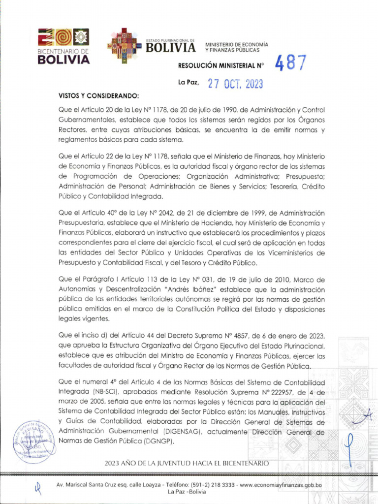 BOLIVIA RESOLUCION MINISTERIAL N° 4 8 7