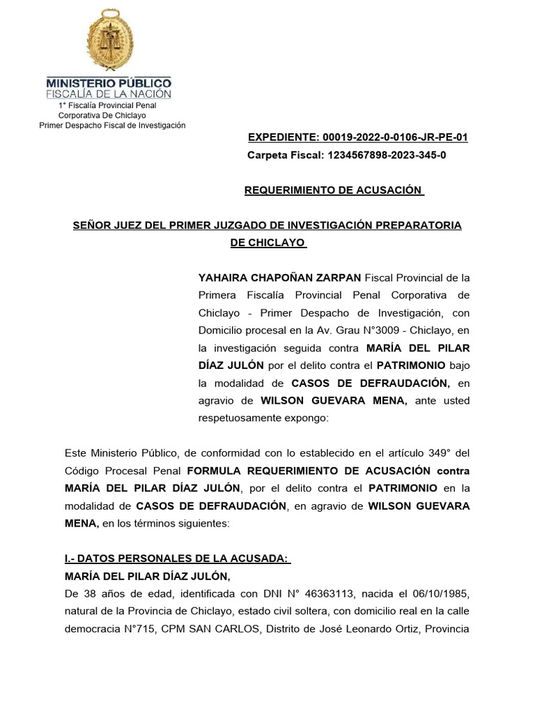 Código Procesal Penal FORMULA REQUERIMIENTO DE ACUSACIÓN contra