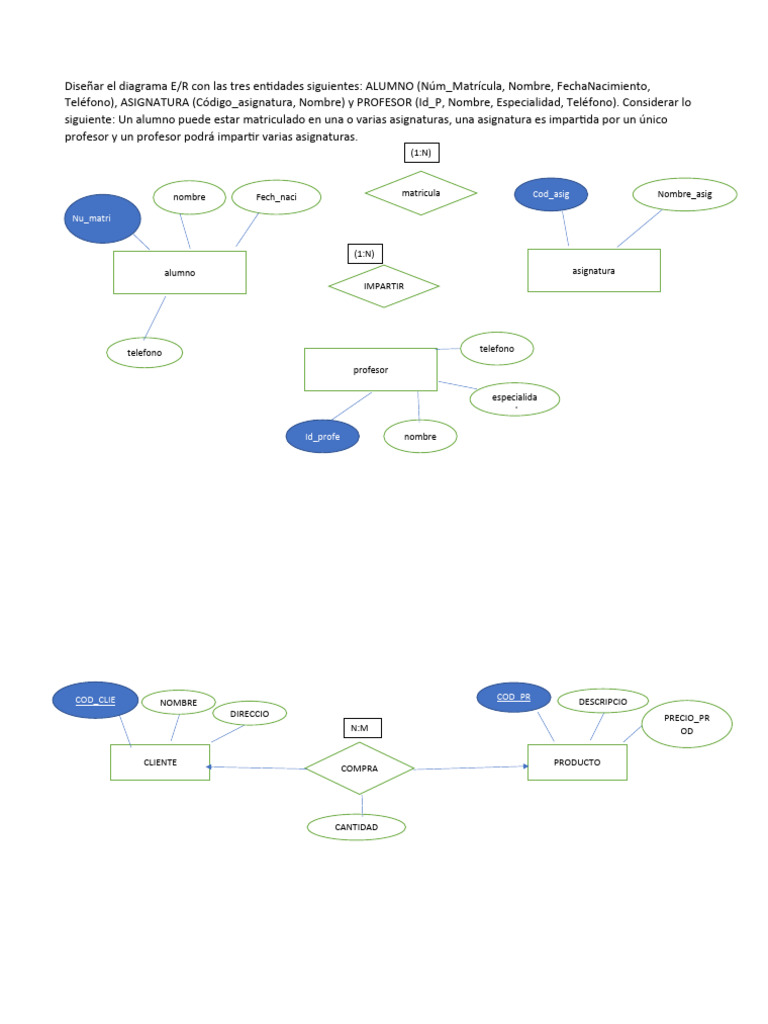 Teléfono), ASIGNATURA (Código_asignatura, Nombre) y PROFESOR (Id_P, Nombre, Especialidad, Teléfono). Considerar lo