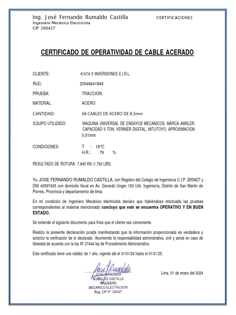 CERTIFICADO DE OPERATIVIDAD DE CABLE ACERADO