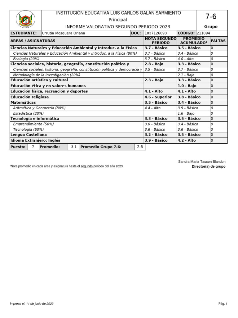 Nota promedio en cada área y asignatura hasta el segundo periodo del año 2023 Director(a) de grupo