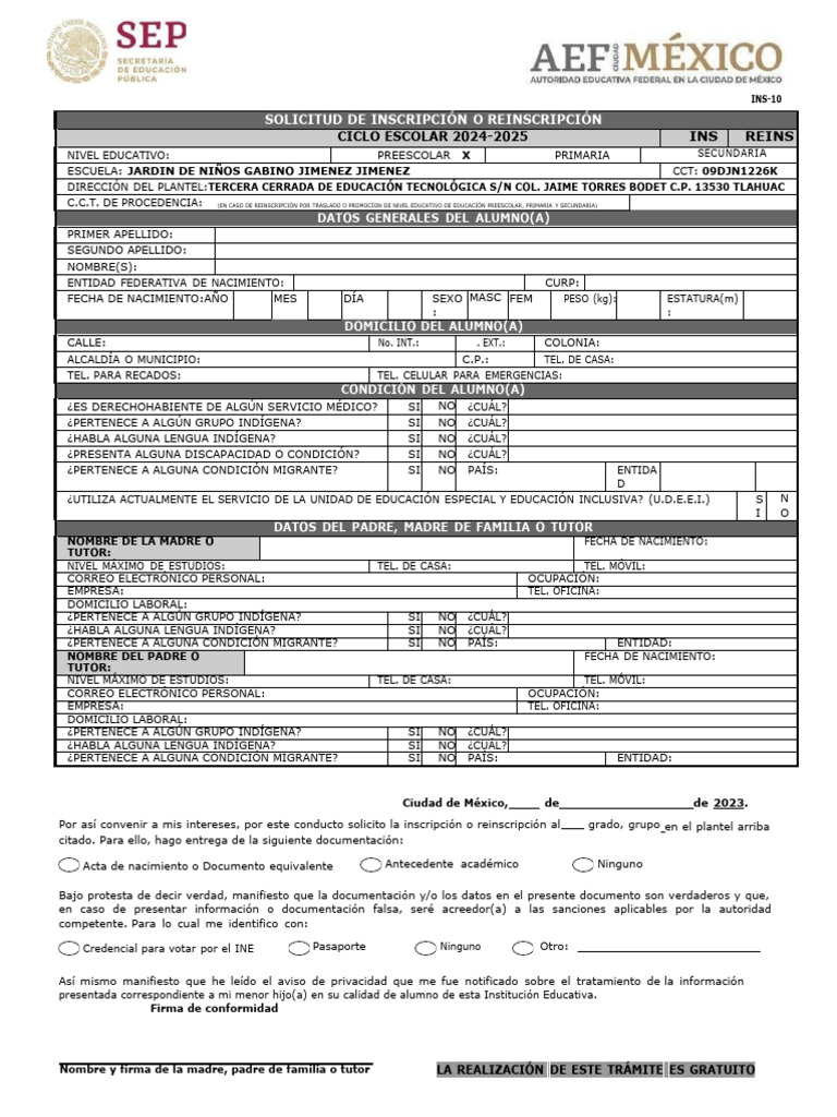 Nombre y firma de la madre, padre de familia o tutor LA REALIZACIÓN DE ESTE TRÁMITE ES GRATUITO