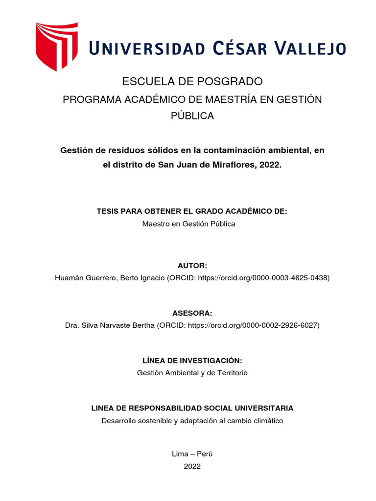 de Tesis titulada: "Gestión de Residuos Sólidos en la Contaminación Ambiental, en el