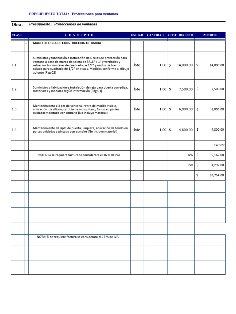 Obra: Presupuesto : Protecciones de ventanas