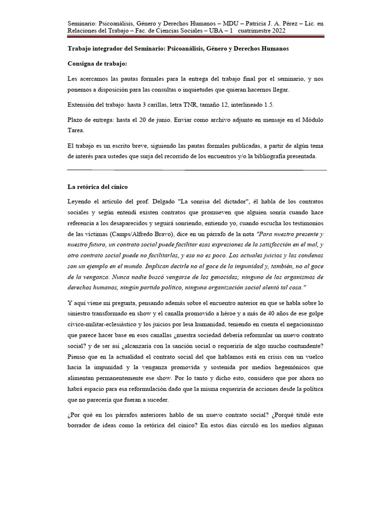 Seminario: Psicoanálisis, Género y Derechos Humanos – MDU – Patricia J. A. Pérez – Lic. en