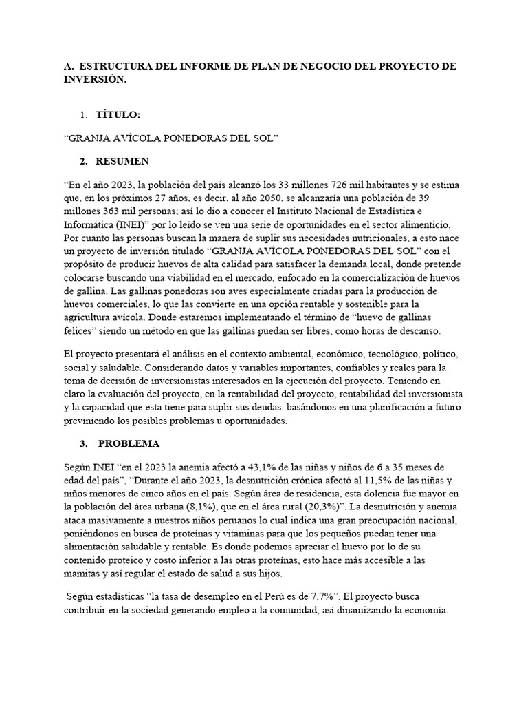un proyecto de inversión titulado “GRANJA AVÍCOLA PONEDORAS DEL SOL” con el