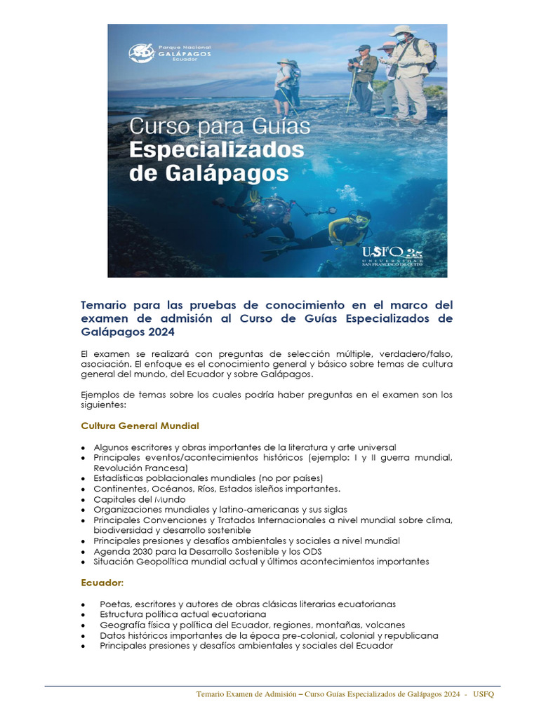 Temario Examen de Admisión – Curso Guías Especializados de Galápagos 2024 - USFQ