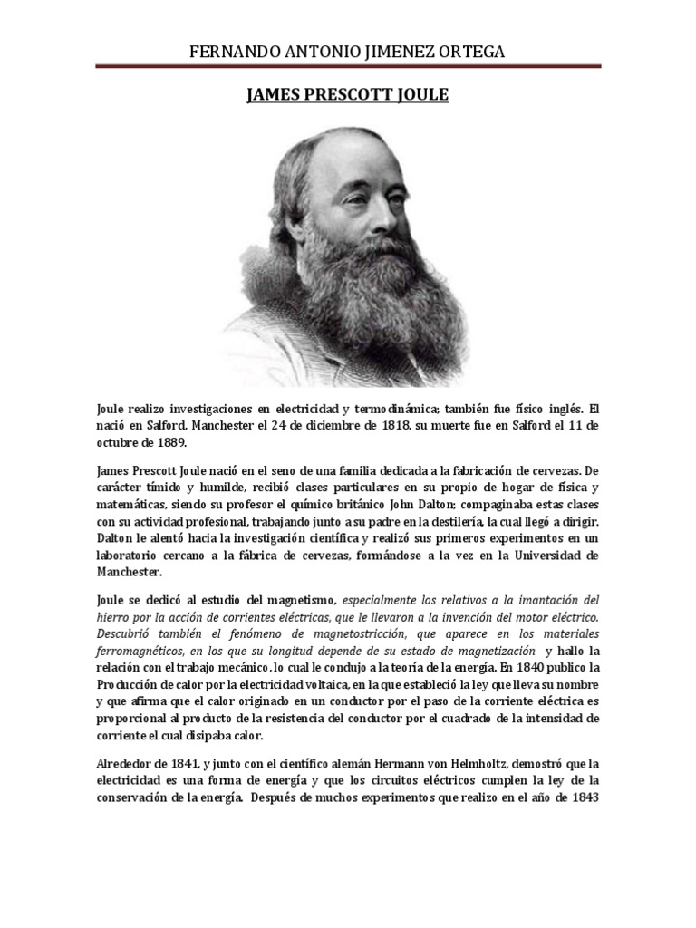Joule realizo investigaciones en electricidad y termodinmica; tambin fue fsico ingls. El naci en Salford, Manchester el 24 de diciembre de 1818, su muerte fue en Salford el 11 de octubre de 1889. James Prescott Joule naci en el seno de una familia dedicada a la fabricacin de cervezas. De carcter tmido y humilde, recibi clases particulares en su propio de hogar de fsica y matemticas, siendo su profesor el qumico britnico John Dalton; compaginaba estas clases con su actividad profesional, trabajando junto a su padre en la destilera, la cual lleg a dirigir. Dalton le alent hacia la investigacin cientfica y realiz sus primeros experimentos en un laboratorio cercano a la fbrica de cervezas, formndose a la vez en la Universidad de Manchester. Joule se dedic al estudio del magnetismo, especialmente los relativos a la imantacin del hierro por la accin de corrientes elctricas, que le llevaron a la invencin del motor elctrico. Descubri tambin el fenmeno de magnetostriccin, que aparece en los materiales ferromagnticos, en los que su longitud depende de su estado de magnetizacin y hallo la relacin con el trabajo mecnico, lo cual le condujo a la teora de la energa. En 1840 publico la Produccin de calor por la electricidad voltaica, en la que estableci la ley que lleva su nombre y que afirma que el calor originado en un conductor por el paso de la corriente elctrica es proporcional al producto de la resistencia del conductor por el cuadrado de la intensidad de corriente el cual disipaba calor. Alrededor de 1841, y junto con el cientfico alemn Hermann von Helmholtz, demostr que la electricidad es una forma de energa y que los circuitos elctricos cumplen la ley de la conservacin de la energa. Despus de muchos experimentos que realizo en el ao de 1843