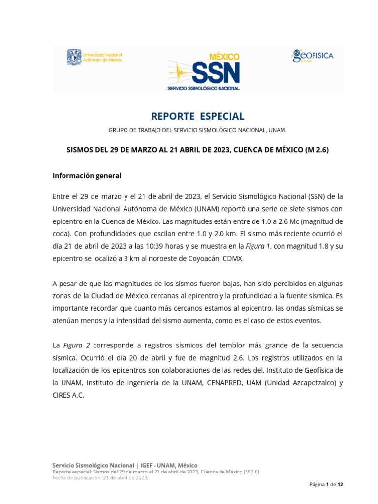 Este reporte ha sido generado por el Servicio Sismológico Nacional (SSN) el día 21 de abril