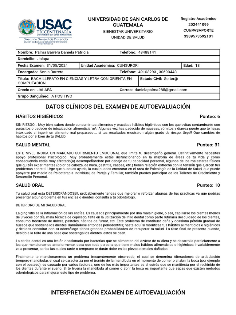 problemas sobre ti. Urge que busques ayuda, la cual puedes encontrar en el Área de Psicología de la Unidad de Salud, que puede