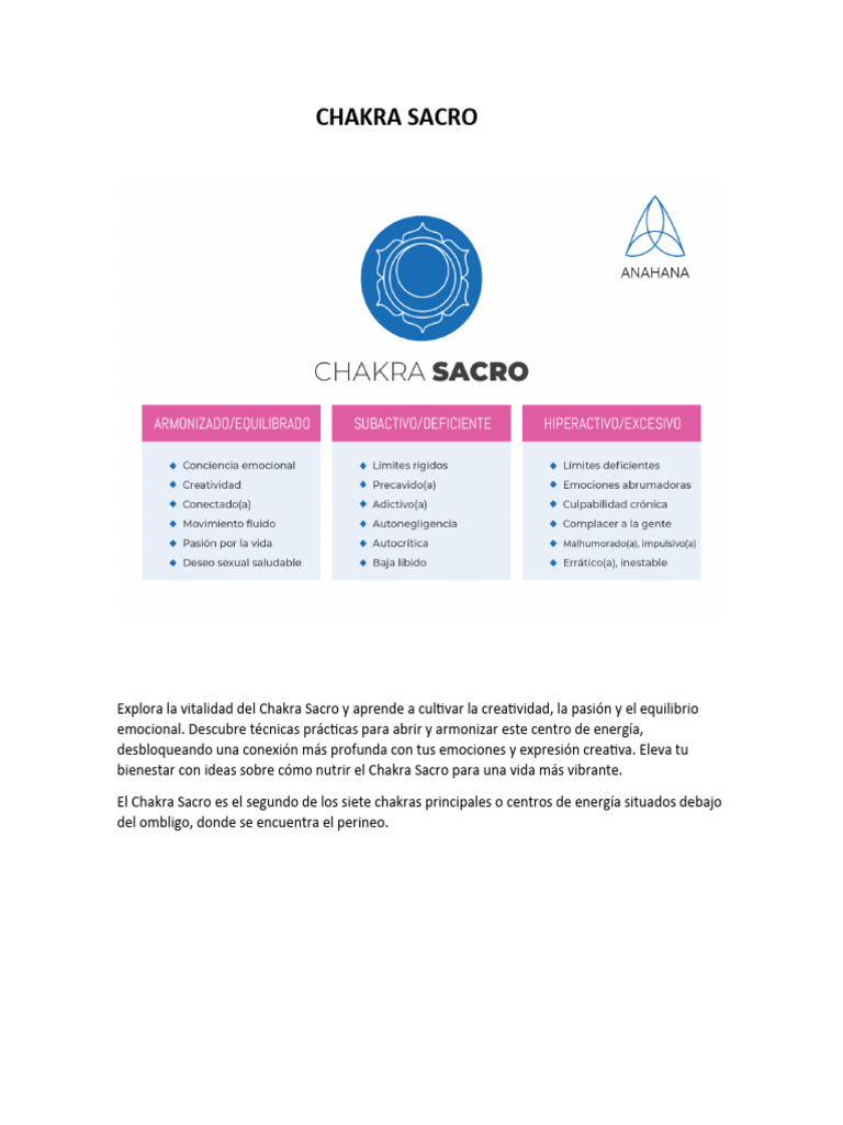 de sí mismo. Un Chakra Sacro equilibrado favorecerá la sensualidad, la creatividad y las emociones