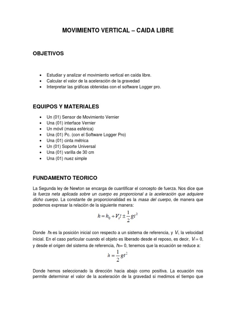 Estudiar y analizar el movimiento vertical en cada libre. Calcular el valor de la aceleracin de la gravedad Interpretar las grficas obtenidas con el software Logger pro.