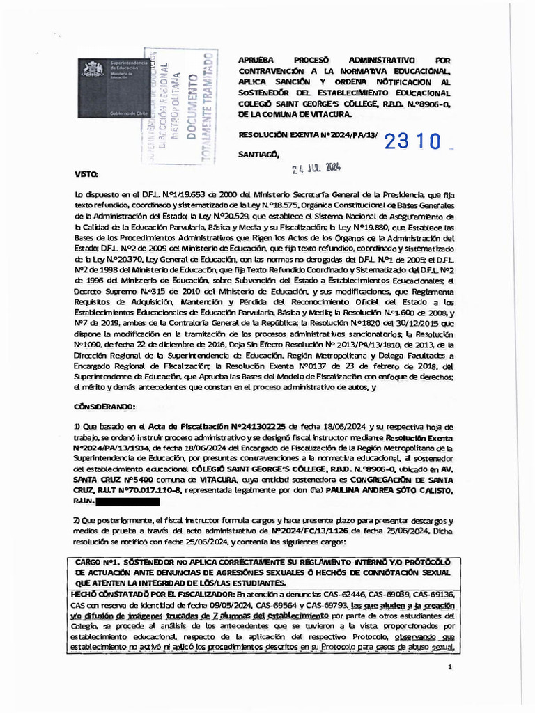 del establecimiento educacional COLEGIO SAINT GEORGE'S COLLEGE, R.B.D. N. 8906-0, ubicado en AV.