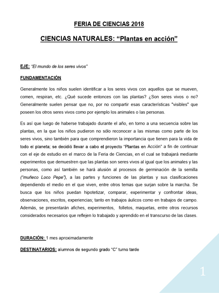 con el eje de estudio en el marco de la Feria de Ciencias, en el cual se trabajará mediante
