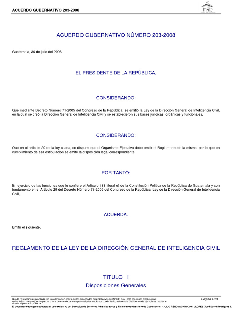 fundamento en el Artículo 29 del Decreto Número 71-2005 del Congreso de la República, Ley de la Dirección General de Inteligencia