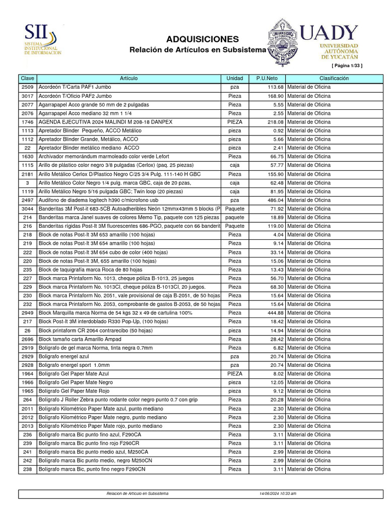 Clave Artículo Material o Servicio Unidad [Link] Clasificación