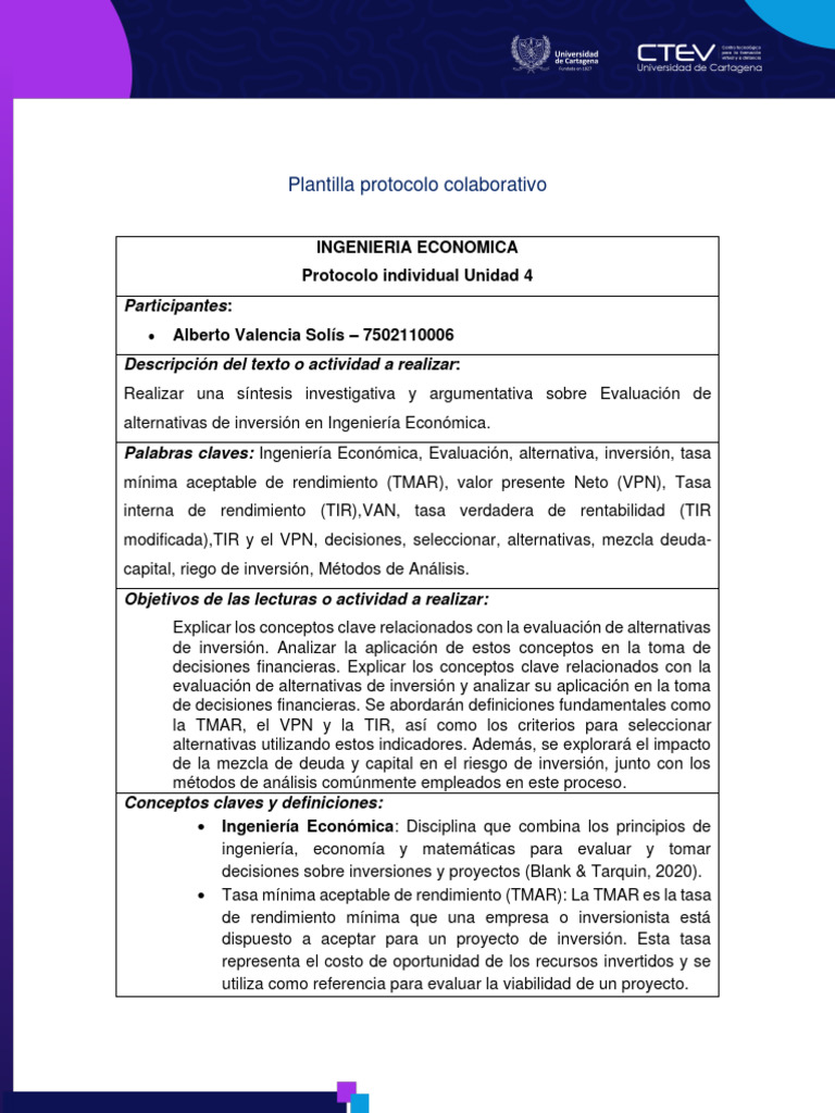 Palabras claves: Ingeniería Económica, Evaluación, alternativa, inversión, tasa
