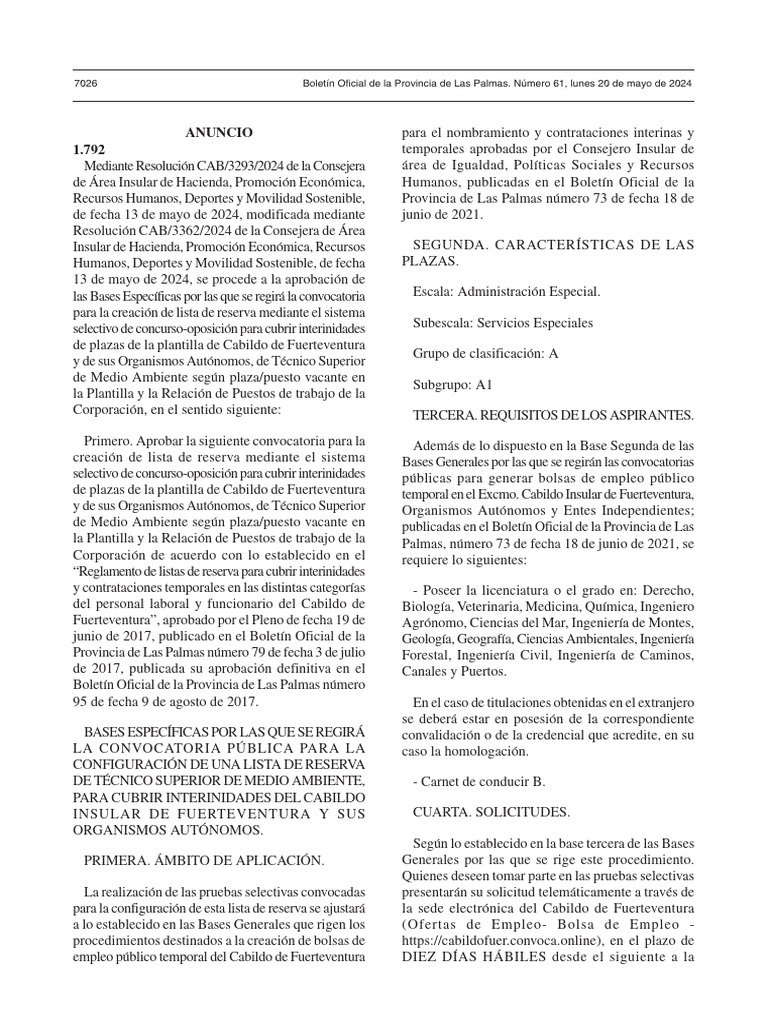 de Medio Ambiente según plaza/puesto vacante en publicadas en el Boletín Oficial de la Provincia de Las
