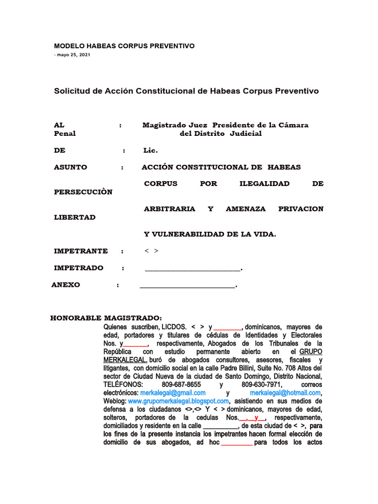 Solicitud de Acción Constitucional de Habeas Corpus Preventivo