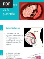 La placenta desempeña varias funciones esenciales durante el embarazo: 1) Intercambio de gases: facilita el intercambio de oxígeno, dióxido de carbono y monóxido de carbono por difusión simple, extrayendo de 20 a 30 ml de oxígeno por minuto de la circulación materna. 2) Intercambio de nutrientes y electrolitos: permite el rápido intercambio de aminoácidos, ácidos grasos libres, carbohidratos y vitaminas. 3) Transferencia de anticuerpos maternos: inicia alrededor de la semana 14, y las inmunoglobulinas ayudan a proporcionar inmunidad pasiva al feto contra enfermedades infecciosas .