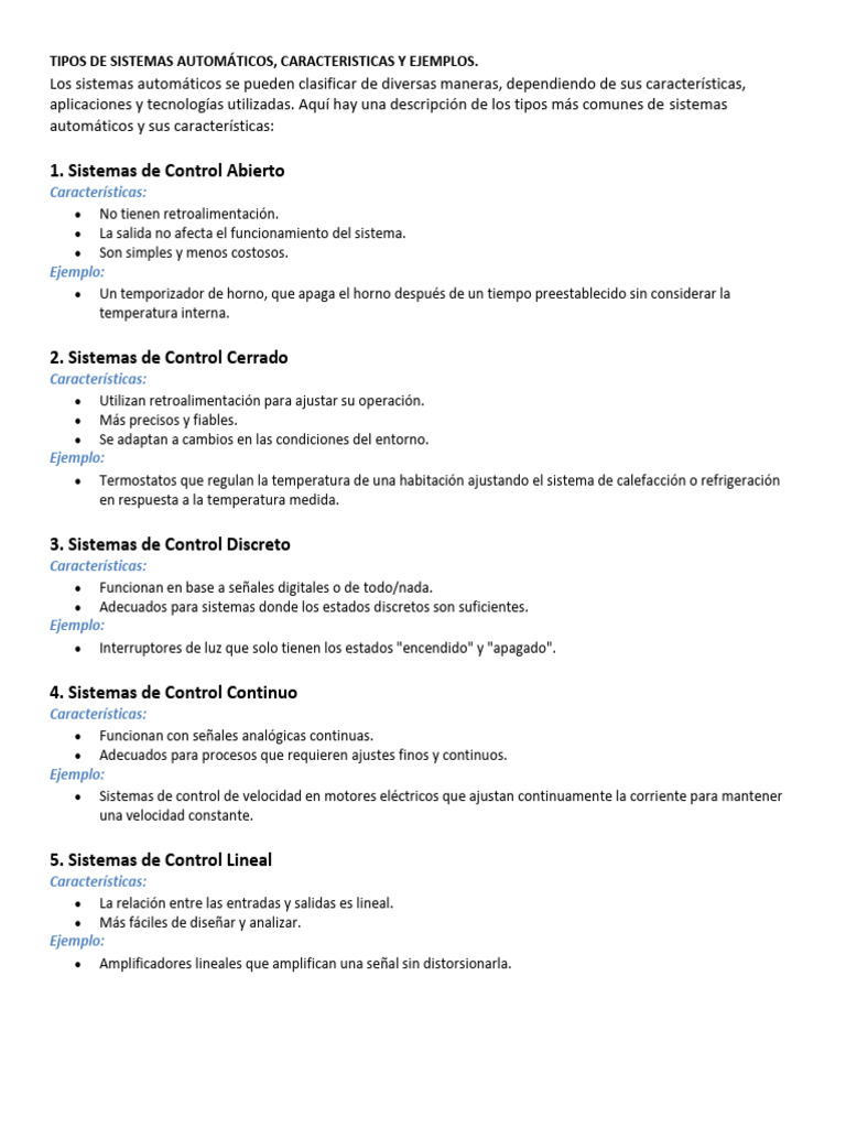 TIPOS DE SISTEMAS AUTOMÁTICOS, CARACTERISTICAS Y EJEMPLOS.