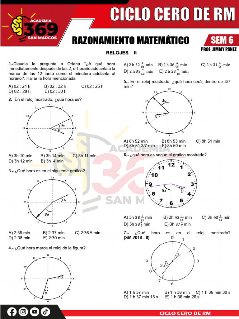 A) 3h 10 min B) 3h 14 min C) 3h 11 min 6.- ¿qué hora es según el grafico mostrado?