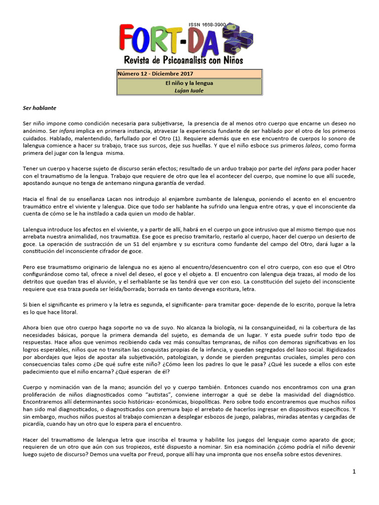 incidencia de la lengua, pero no va de suyo que un niño devenga sujeto de discurso. Tomaré a continuación algunas viñetas