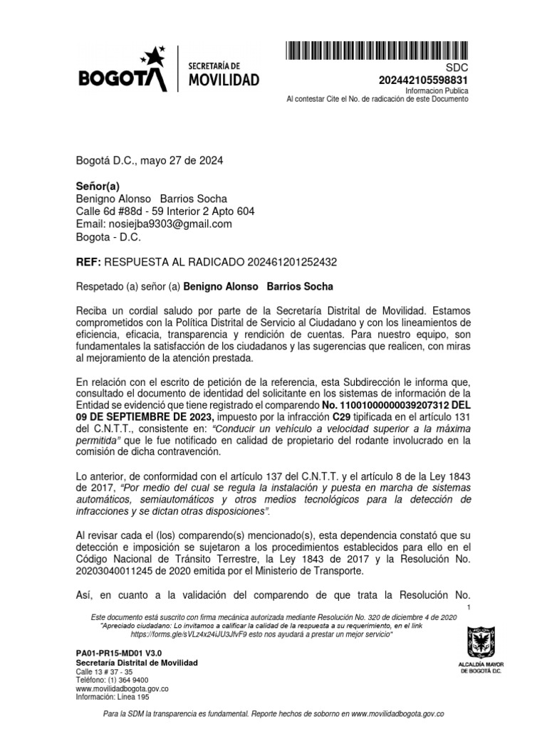 Reciba un cordial saludo por parte de la Secretaría Distrital de Movilidad. Estamos