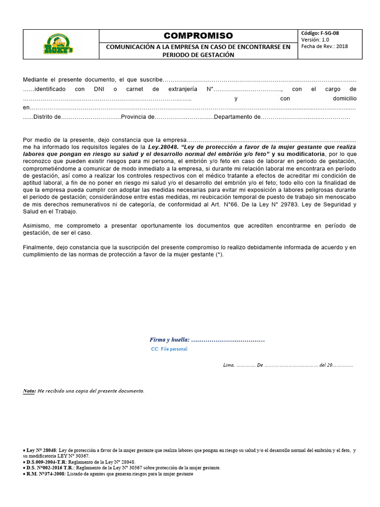 me ha informado los requisitos legales de la Ley.28048. “Ley de protección a favor de la mujer gestante que realiza