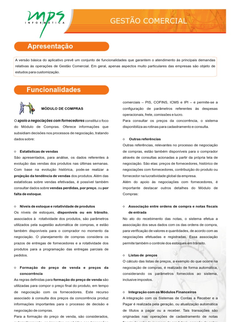 A verso bsica do aplicativo prev um conjunto de funcionalidades que garantem o atendimento s principais demandas relativas s operaes de Gesto Comercial. Em geral, apenas aspectos muito particulares das empresas so objeto de estudos para customizao.