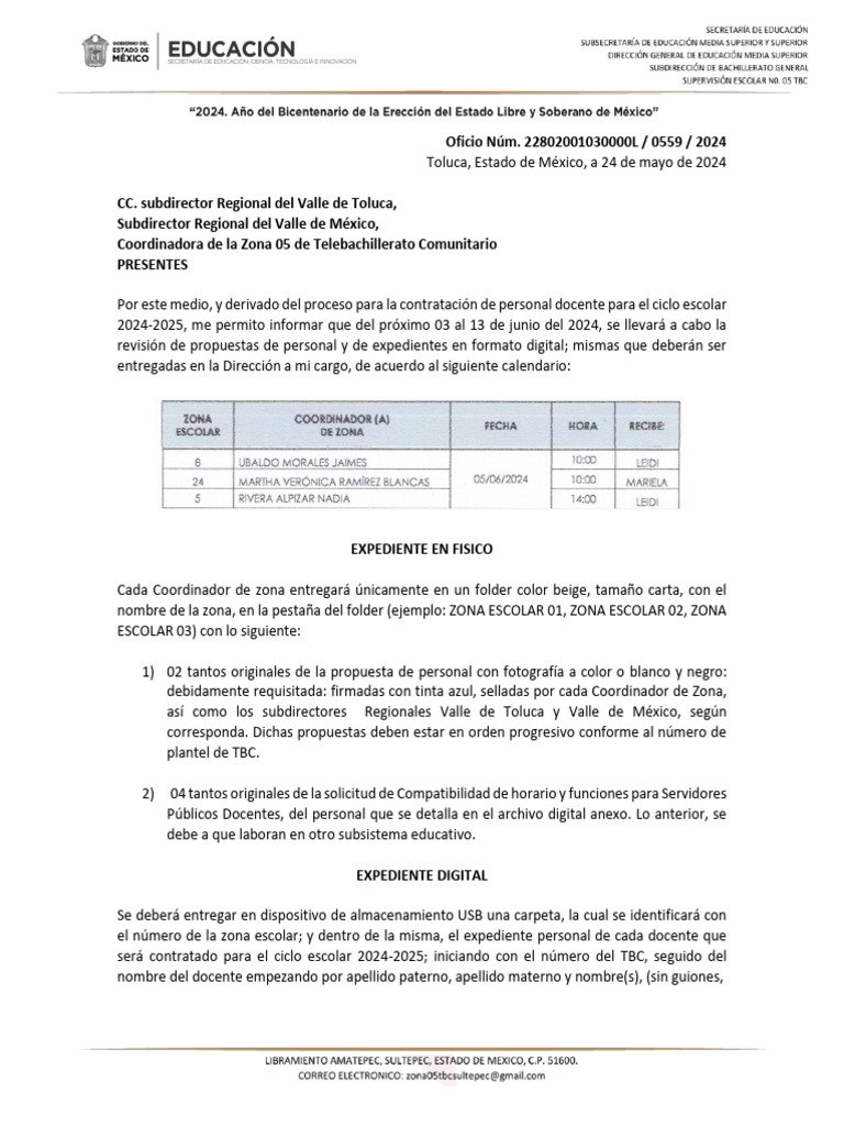 será contratado para el ciclo escolar 2024-2025; iniciando con el número del TBC, seguido del