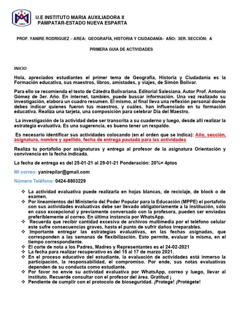 PROF. YANIRE RODRIGUEZ – AREA: GEOGRAFÍA, HISTORIA Y CIUDADANÍA- AÑO: 3ER. SECCIÓN: A