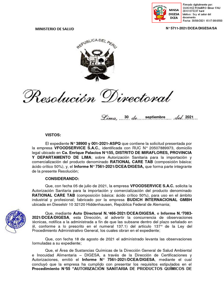 MINISTERIO DE SALUD N° 5711-2021/DCEA/DIGESA/SA