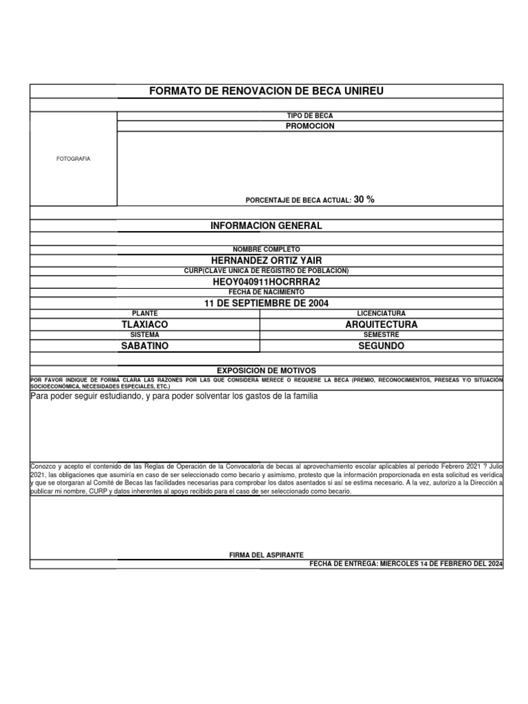 PORCENTAJE DE BECA ACTUAL: 30 %