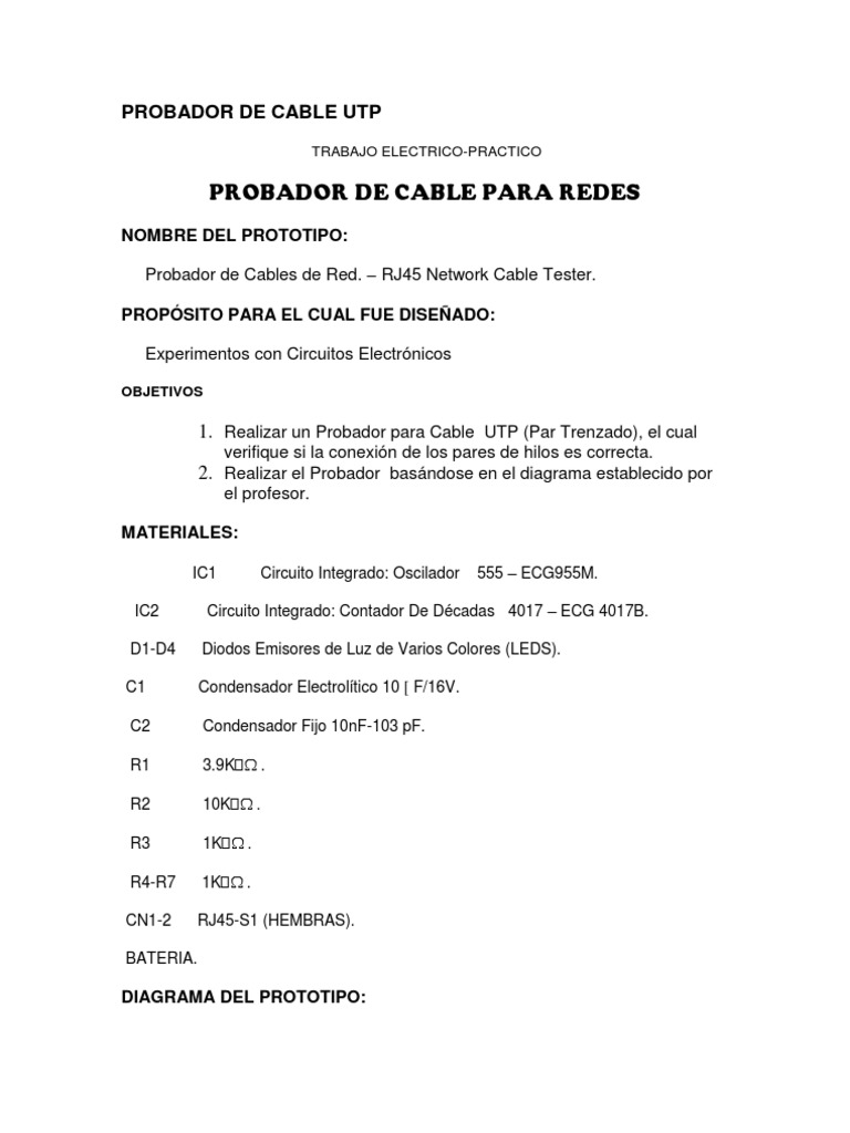 NOMBRE DEL PROTOTIPO: Probador de Cables de Red. RJ45 Network Cable Tester. PROPSITO PARA EL CUAL FUE DISEADO: Experimentos con Circuitos Electrnicos