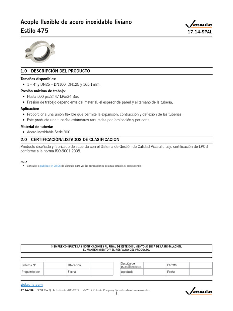 17.14-SPAL 3594 Rev Q Actualizado al 05/2019 © 2019 Victaulic Company. Todos los derechos reservados.
