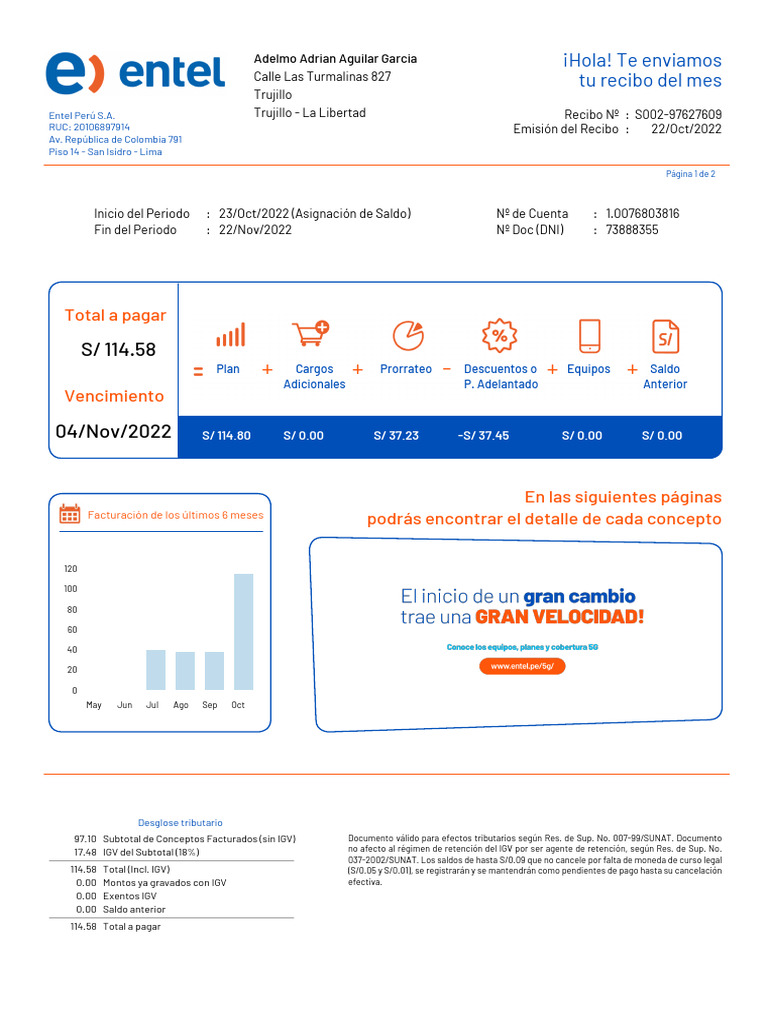 Entel Perú S.A. Trujillo - La Libertad Recibo Nº : S002-97627609