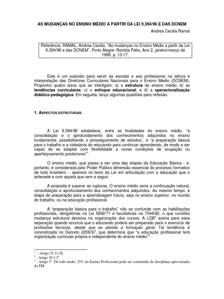 As mudanas no Ensino Mdio a partir da Lei 9.394/96 e das DCNEM. Porto Alegre: Revista Ptio, Ano 2, janeiro/maro de 1999. p. 13-17.