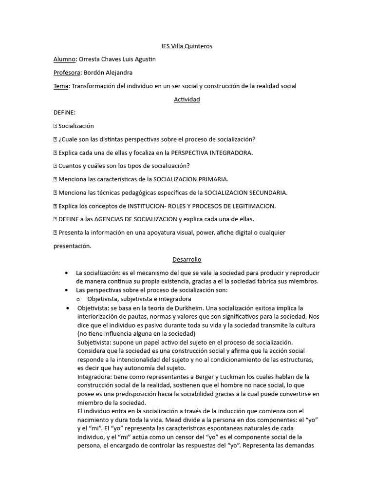 Tema: Transformación del individuo en un ser social y construcción de la realidad social