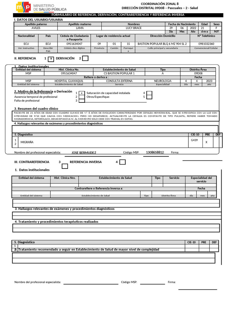 Nombre del profesional especialista: JOSE BERMUDE Z Código MSP: 1308658812 Firma: