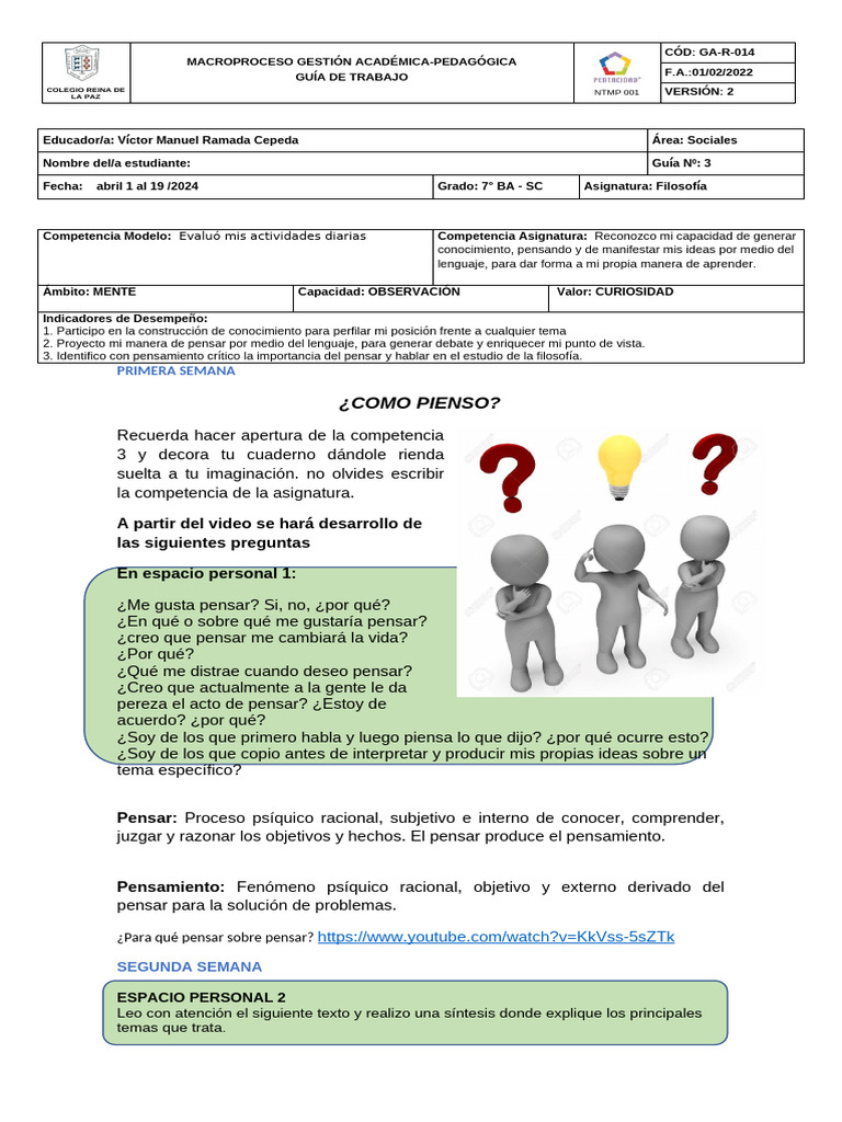 Fecha: abril 1 al 19 /2024 Grado: 7° BA - SC Asignatura: Filosofía