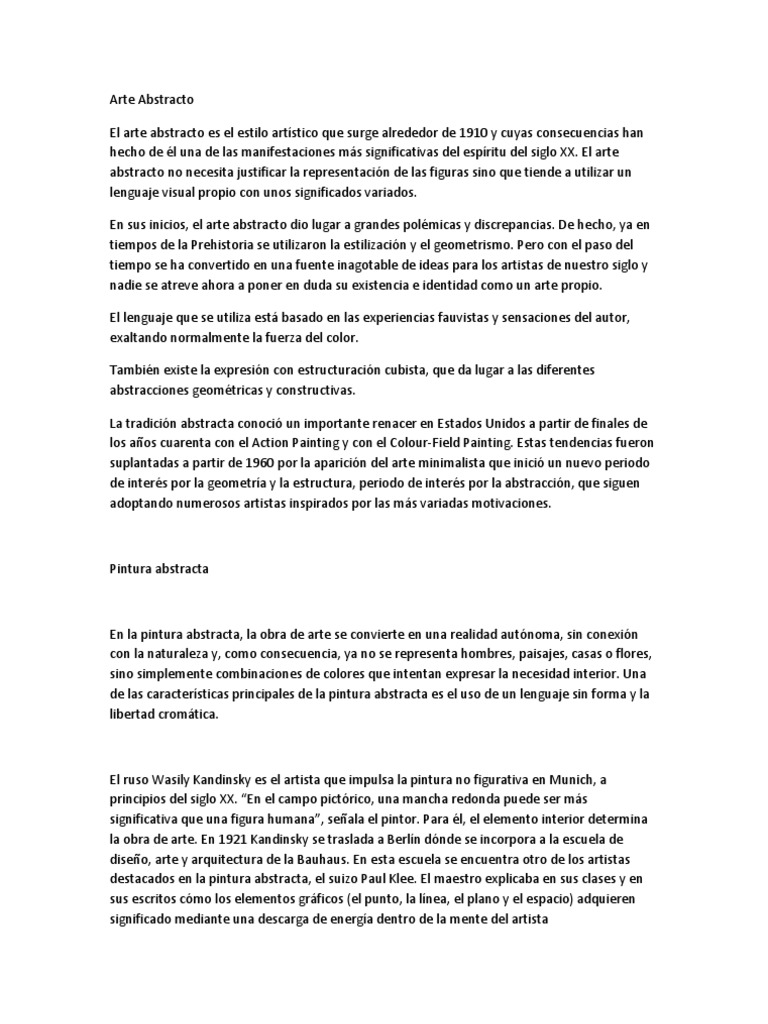 de las manifestaciones ms significativas del espritu del siglo XX. El arte abstracto no necesita justificar la representacin de las figuras sino que tiende a utilizar un lenguaje visual propio con unos significados variados. En sus inicios, el arte abstracto dio lugar a grandes polmicas y discrepancias. De hecho, ya en tiempos de la Prehistoria se utilizaron la estilizacin y el geometrismo. Pero con el paso del tiempo se ha convertido en una fuente inagotable de ideas para los artistas de nuestro siglo y nadie se atreve ahora a poner en duda su existencia e identidad como un arte propio. El lenguaje que se utiliza est basado en las experiencias fauvistas y sensaciones del autor, exaltando normalmente la fuerza del color. Tambin existe la expresin con estructuracin cubista, que da lugar a las diferentes abstracciones geomtricas y constructivas. La tradicin abstracta conoci un importante renacer en Estados Unidos a partir de finales de los aos cuarenta con el Action Painting y con el Colour-Field Painting. Estas tendencias fueron suplantadas a partir de 1960 por la aparicin del arte minimalista que inici un nuevo periodo de inters por la geometra y la estructura, periodo de inters por la abstraccin, que siguen adoptando numerosos artistas inspirados por las ms variadas motivaciones.