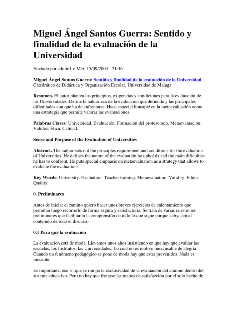 Enviado por admin1 o Mr, 15/09/2004 - 21:46 Miguel ngel Santos Guerra: Sentido y finalidad de la evaluacin de la Universidad Catedrtico de Didctica y Organizacin Escolar, Universidad de Mlaga Resumen. El autor plantea los principios, exigencias y condiciones para la evaluacin de las Universidades. Define la naturaleza de la evaluacin que defiende y las principales dificultades con que ha de enfrentarse. Hace especial hincapi en la metaevaluacin como una estrategia que permite valorar las evaluaciones. Palabras Claves: Universidad. Evaluacin. Formacin del profesorado. Metaevaluacin. Validez. tica. Calidad. Sense and Purpose of the Evaluation of Universities Abstract. The author sets out the principles requirement and conditions for the evaluation of Universities. He defines the nature of the evaluatin he upho1ds and the main dificulties he has to confront. He puts special emphasis on metaevaluation as a strategy that allows to evaluate the evaluations. Key Words: University. Evaluation. Teacher training. Metaevaluation. Vatidity. Ethics. Quality. 0. Preliminares Antes de iniciar el camino quiero hacer unos breves ejercicios de calentamiento que permitan luego recorrerlo de forma segura y satisfactoria. Se trata de varias cuestiones preliminares que facilitarn la comprensin de todo lo que sigue porque subyacen al contenido de todo el discurso. 0.1 Para qu la evaluacin La evaluacin est de moda. Llevamos unos aos insistiendo en que hay que evaluar las escuelas, los Institutos, las Universidades. Lo cual no es motivo inexcusable de alegra. Cuando un fenmeno pedaggico se pone de moda hay que estar prevenidos. Nada es inocente. Es importante, eso s, que se rompa la exclusividad de la evaluacin del alumno dentro del sistema educativo. Pero no hay que frotarse las manos de satisfaccin por el solo hecho de