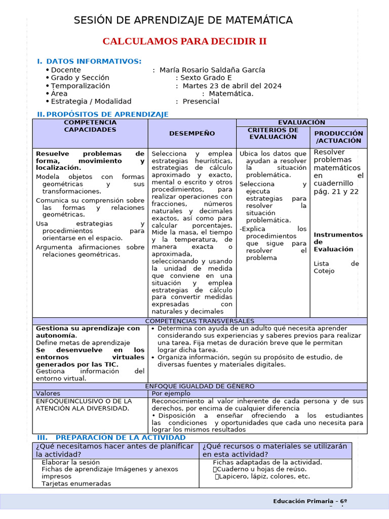Título de la actividad: CALCULAMOS PARA DECIDIR I Sexto Grado Sección “C”