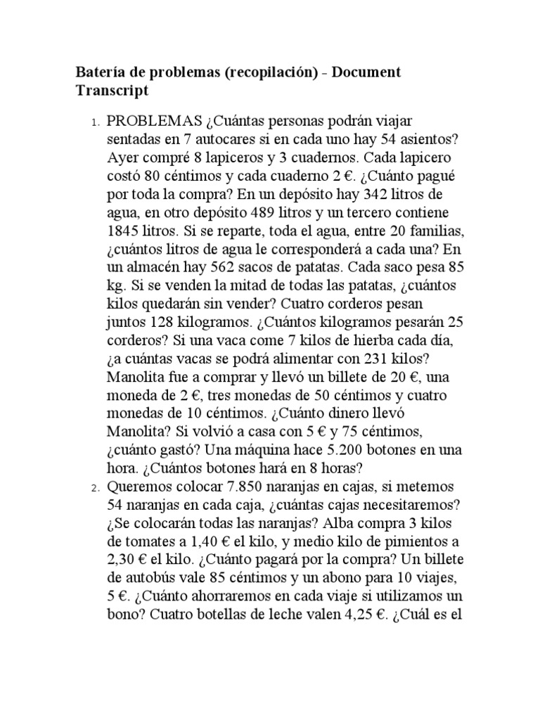 PROBLEMAS Cuntas personas podrn viajar sentadas en 7 autocares si en cada uno hay 54 asientos? Ayer compr 8 lapiceros y 3 cuadernos. Cada lapicero cost 80 cntimos y cada cuaderno 2 . Cunto pagu por toda la compra? En un depsito hay 342 litros de agua, en otro depsito 489 litros y un tercero contiene 1845 litros. Si se reparte, toda el agua, entre 20 familias, cuntos litros de agua le corresponder a cada una? En un almacn hay 562 sacos de patatas. Cada saco pesa 85 kg. Si se venden la mitad de todas las patatas, cuntos kilos quedarn sin vender? Cuatro corderos pesan juntos 128 kilogramos. Cuntos kilogramos pesarn 25 corderos? Si una vaca come 7 kilos de hierba cada da, a cuntas vacas se podr alimentar con 231 kilos? Manolita fue a comprar y llev un billete de 20 , una moneda de 2 , tres monedas de 50 cntimos y cuatro monedas de 10 cntimos. Cunto dinero llev Manolita? Si volvi a casa con 5 y 75 cntimos, cunto gast? Una mquina hace 5.200 botones en una hora. Cuntos botones har en 8 horas? Queremos colocar 7.850 naranjas en cajas, si metemos 54 naranjas en cada caja, cuntas cajas necesitaremos? Se colocarn todas las naranjas? Alba compra 3 kilos de tomates a 1,40 el kilo, y medio kilo de pimientos a 2,30 el kilo. Cunto pagar por la compra? Un billete de autobs vale 85 cntimos y un abono para 10 viajes, 5 . Cunto ahorraremos en cada viaje si utilizamos un bono? Cuatro botellas de leche valen 4,25 . Cul es el