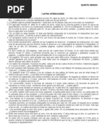tardara en recorrer 1.476 km? Cul es el nmero que, al dividirlo por 13, da 27 de cociente y 12 de resto? Un viajante recorri en una semana 1.360 km. Cada 20 km gasta 2 l de gasleo que cuesta 99 cts el litro. Cunto ha gastado en gasolina el viajante? Se reparten 50 caramelos en partes iguales entre un cierto nmero de nios. Tocan 4 caramelos a cada nio y sobran an 2 caramelos. Cuntos nios participan en el reparto? La capacidad de un tonel es de 258 l. El tonel est lleno de vino que se vende de la siguiente manera: la tercera parte, a 59 cts/ l y el resto, a 63 cts/l. Cunto se obtiene por la venta? 6. Un coche recorre 72 km en 1 hora. Cuntos metros recorre en 1 hora? Y en media hora? Y en 1 segundo? Pedro recorre el trayecto desde su casa al colegio 4 veces al da. Al cabo de 7 das ha recorrido 35 km. A qu distancia del colegio vive Pedro? El primer clasificado en una maratn tard 5 h, 23 min y 14 s. El ltimo clasificado qued a 56 min y 37 s del ganador. Cunto tiempo necesit el ltimo clasificado para acabar la carrera? Juan compr el lunes 3 cajas de 6 lpices cada una y el martes 2 cajas ms de 4 lpices cada una. Cuntos lpices tiene en total?: Patricia y Santiago tienen que repartir 257 libros entre 25 cajas. Cuntas cajas tendrn que utilizar? Cuntos libros quedarn en la caja menos llena? En un estadio quedan 13.237 localidades libres despus de vender 45.678 localidades a 10 euros las ms baratas y a 30 euros las ms caras. Cuntas localidades hay en el estadio? Un padre tiene 42 aos. Su hijo tiene 3/7 de la edad del padre: Cul es la edad del