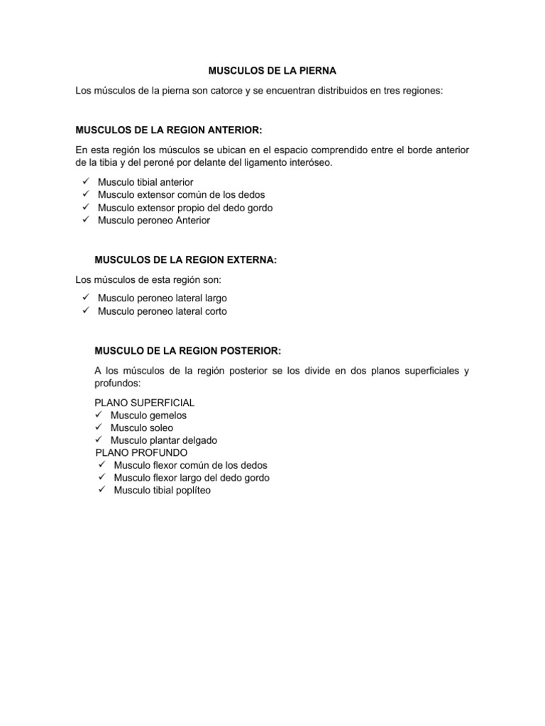 Los músculos de la pierna son catorce y se encuentran distribuidos en tres regiones: