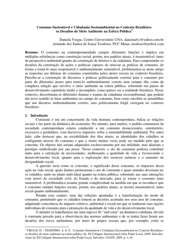 VIEGAS, D. ; TEODSIO, A. S. S. . Consumo Sustentvel e Cidadania Socioambiental no Contexto Brasileiro: os desafios do meio ambiente na esfera pblica. In: XI Colquio Internacional sobre Poder Local, 2009, Salvador. Anais do XI Colquio Internacional sobre Poder Local. Salvador: CIAGS, 2009. p. 1-16.
