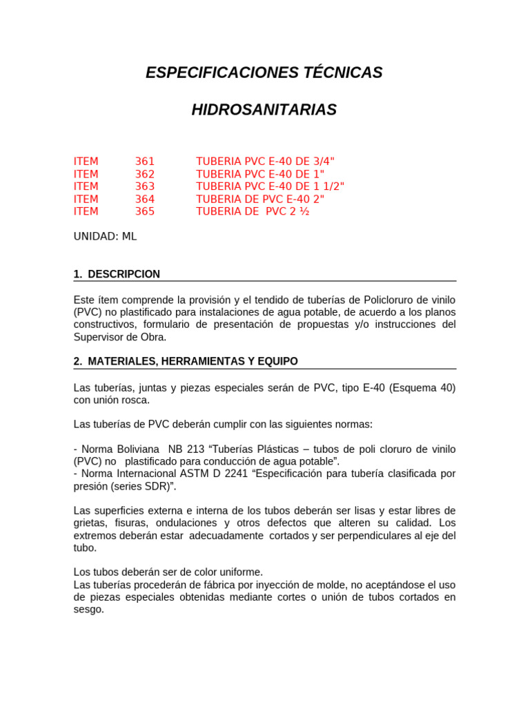 ITEM 362 TUBERIA PVC E-40 DE 1"